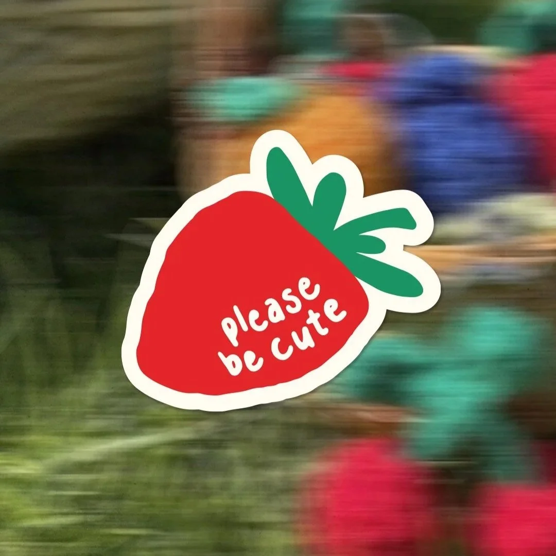 Please Be Cute" is a playful, tactile brand specializing in handmade crochet keychain blind boxes. To capture the "perfectly imperfect" nature of fiber arts, I developed a visual identity rooted in hand-drawn illustrations and high-energy primary tones. Every element—from the strawberry logo to the custom iconography—was drawn by hand to ensure the brand felt as personal and "sketchbook-to-shelf" as the products themselves.